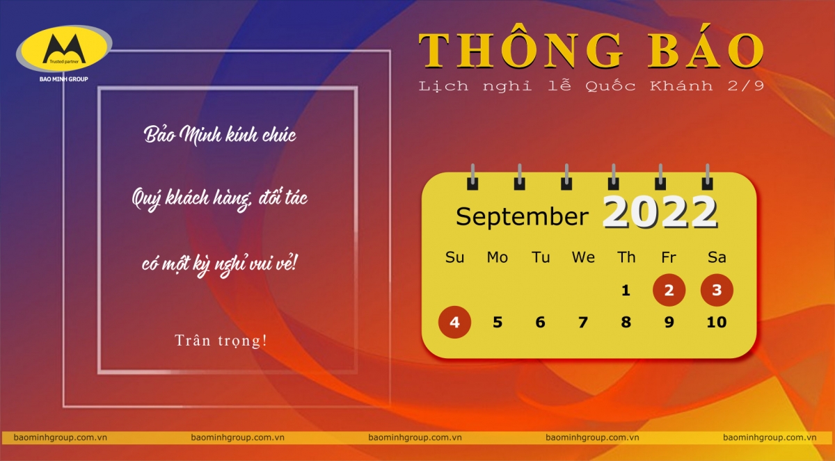 Công ty Cổ Phần Đầu Tư - Xây Dựng & Thương Mại Bảo Minh trân trọng thông báo, lịch nghỉ lễ Quốc Khánh của